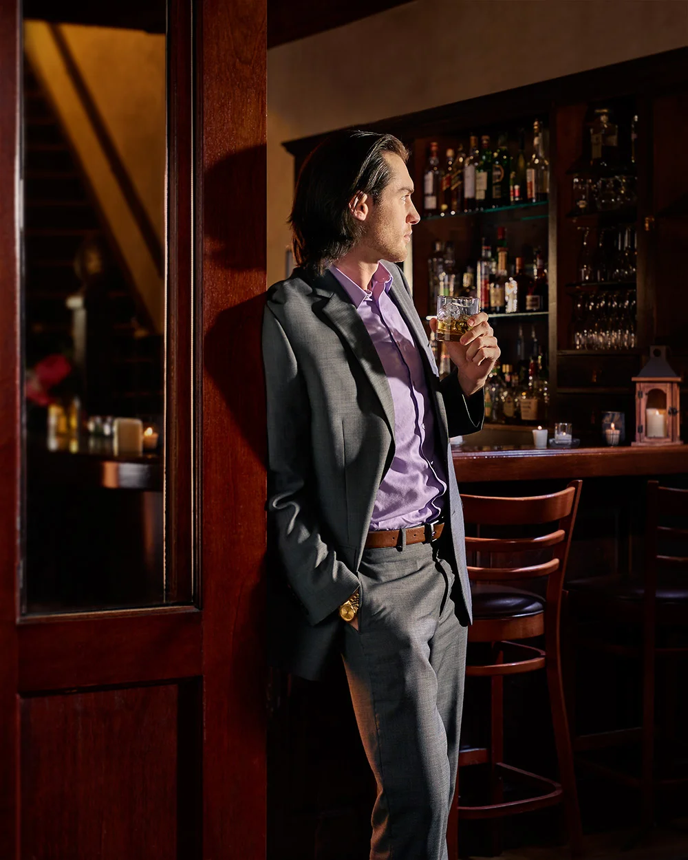 After getting access to the restaurant, I scouted the interior for inspiration on what images I could produce and decided on three. First would be a main product shot, focusing on the bottle, with the models outside on the terrace out of focus. (To read more about this specific image, visit my blog.) Second would be an image of each model standing on the terrace alone and “peacocking,” as Joe put it. Last, would be the image of them flirting at the bar.